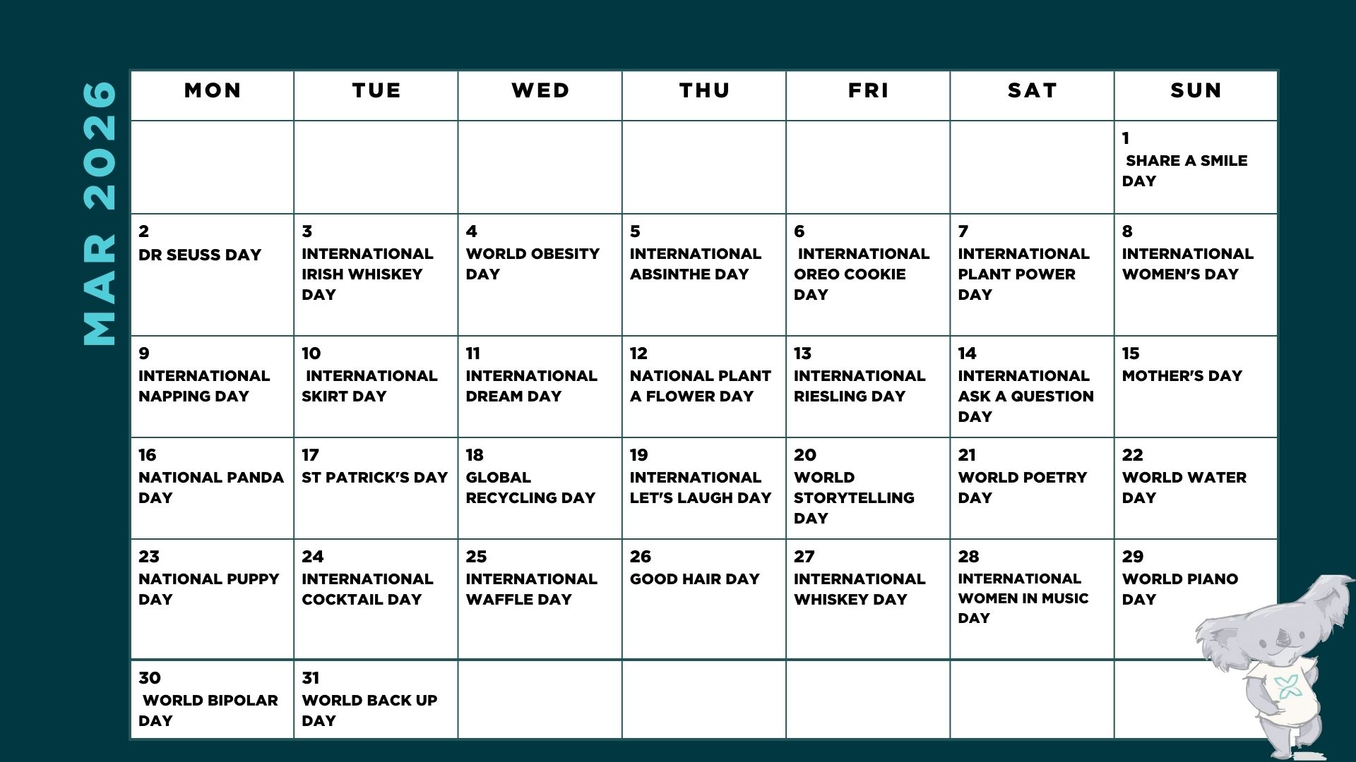 Starting strong with Share a Smile Day, on this day in your social media content calendar March 2026, spread kindness by smiling wherever possible – you may find people returning them quite frequently.
